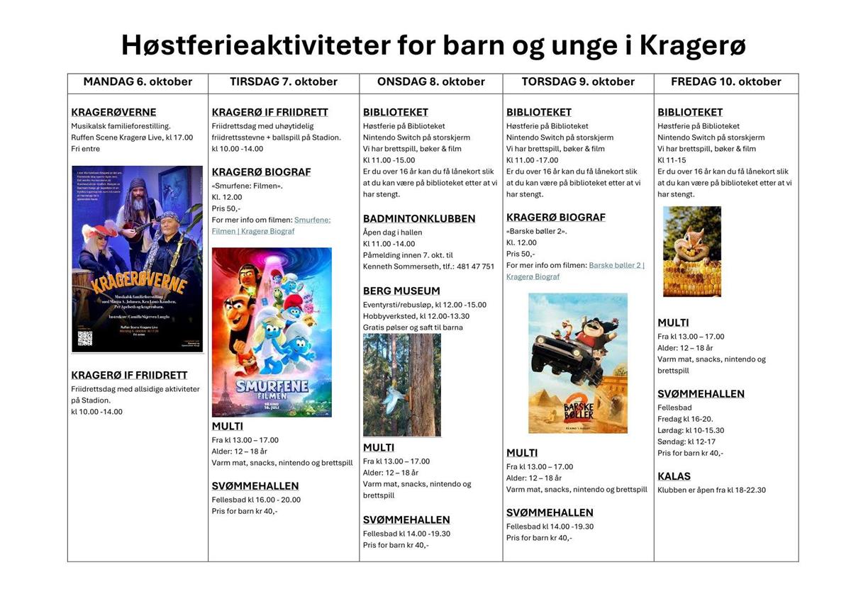 Høstferie aktiviteter for barn og ungeDet er et variert og spennende program for høstferie aktiviteter for barn og unge i Kragerø Publisert 01.10.2025 09.01