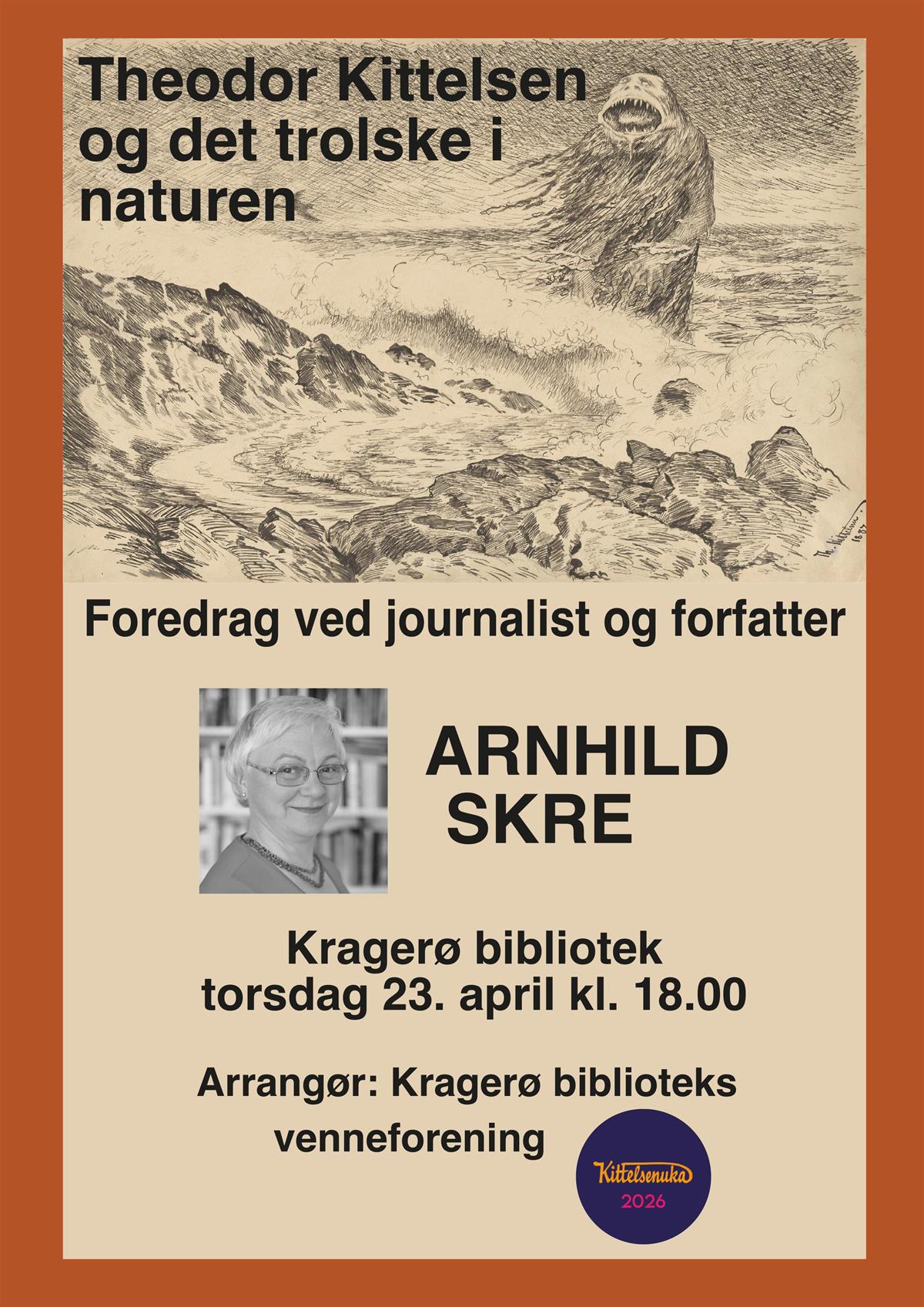 Arnhild Skre er historiker, journalist og forfatter. Hun har jobbet i NRK, Dag og Tid og Aftenposten. Hun har skrevet flere biogafier, bl.a. om Theodor Kittelsen, Berge Furre, Raghild Jølsen og Hulda Garborg. Hun fikk Brageprisen for boka om Hulda Garborg. I 2015 utgav hun biografien om Kittelsen. Kragerø biblioteks venneforening har invitert henne til å holde foredrag på Kragerø bibliotek om Kittelsen i forbindelse med Kittelsenuka 2026