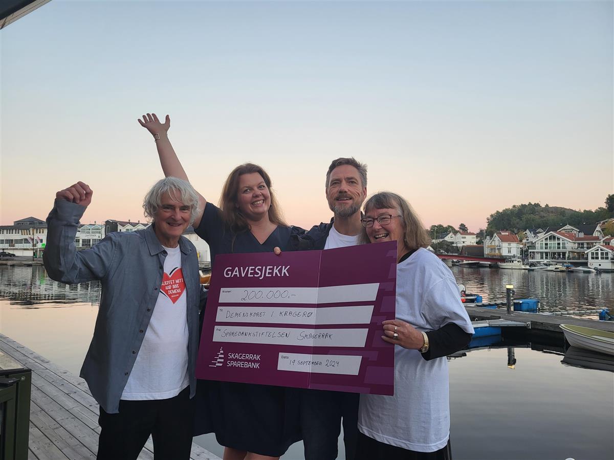 Robert Carding, Linda Heggernes Varpe, Kjetil Valdal og Anne Carding med gavesjekk på 200.000 til videre drift av demenskoret